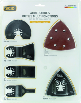 Lot de 15 accessoires pour machines portatives multifonctions. S'adapte à toutes les marques du marché pour couper, épurer et poncer. Composition : 1 plateau auto-agrippant, triangulaire de 93 mm, 10 patin au corindon brun (grain : 3 x 60 - 4 x 80 - 3 x 120), 1 lame de scie segmentée acier de 80 mm, 1 lame de scie plongeante acier de 10 mm, 1 lame de scie plongeante acier de 34 mm et un grattoir acier 52 mm.